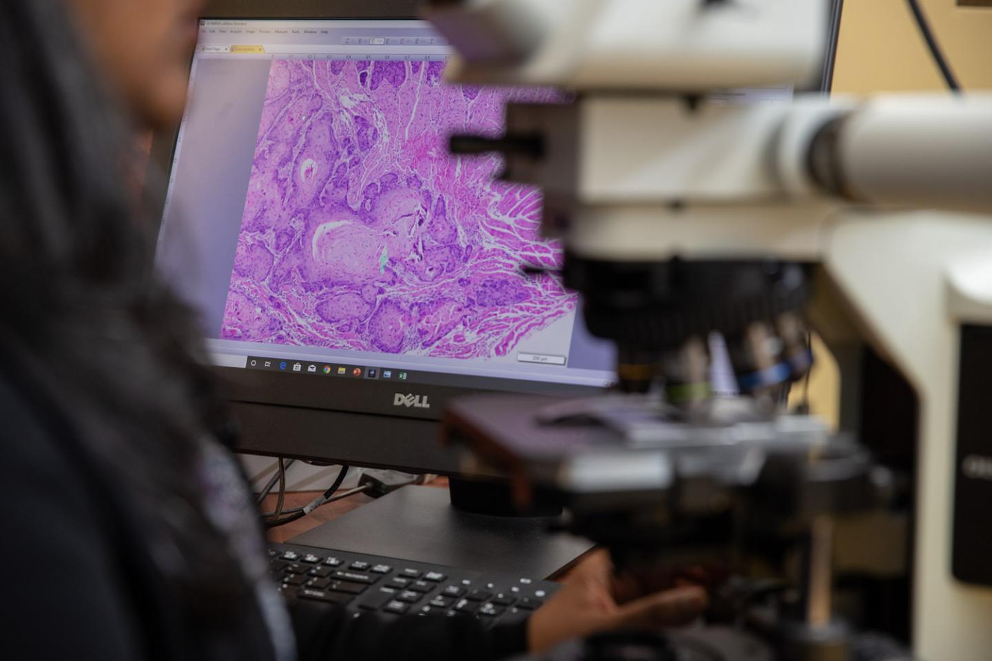 image: Aditi Bhattacharya, PhD, examines oral cancer using a microscope.