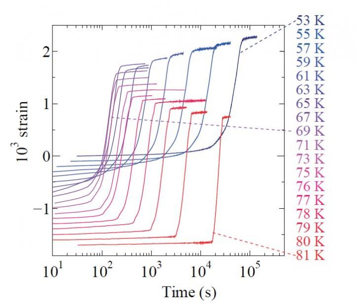 image: Time dependence of the strain for a barium-vanadium oxide at various temperatures.