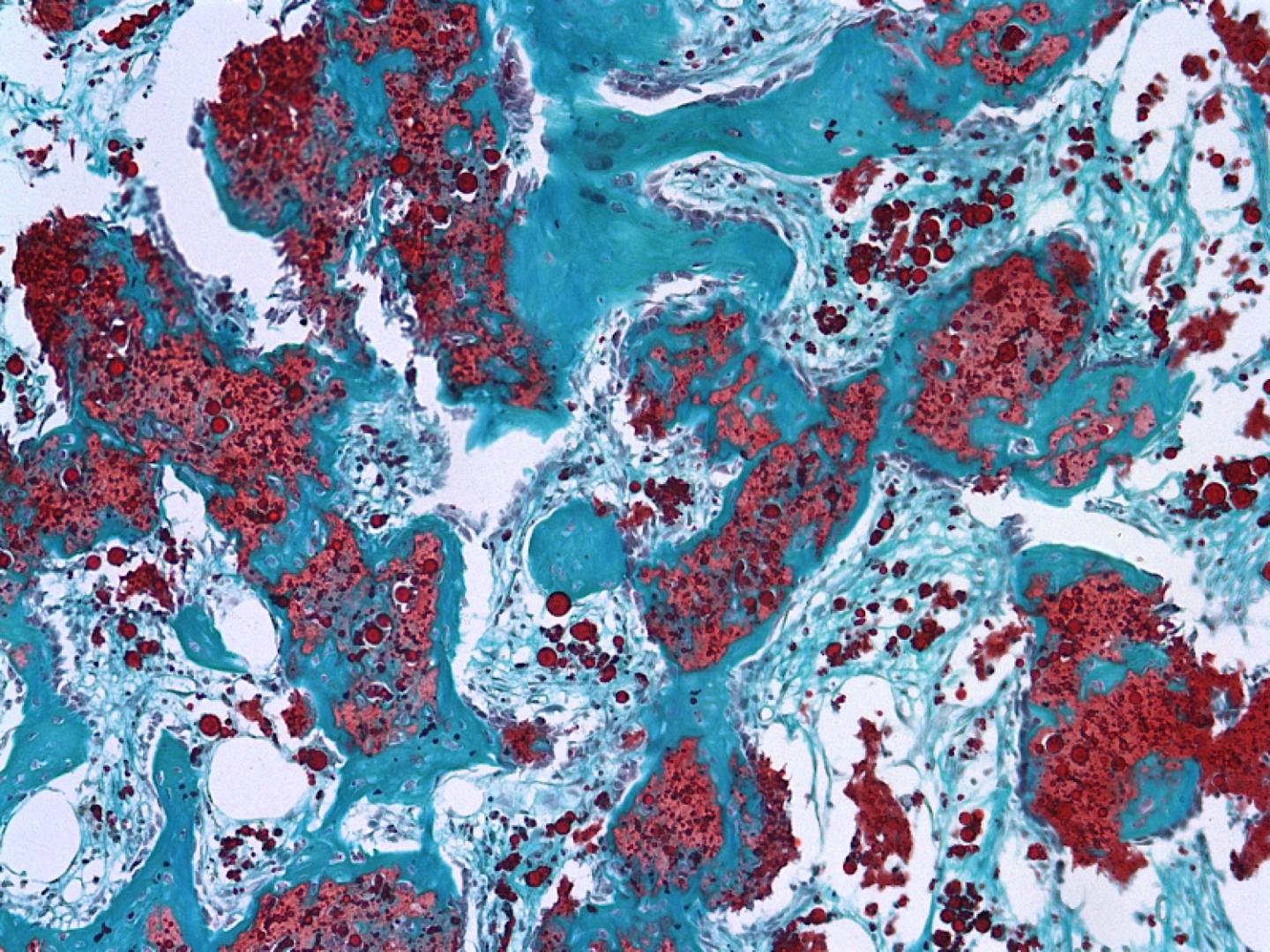 image: Heparin microparticles used to deliver bone morphogenetic protein are shown, in red, binding to a defective femur in a rat. The heparin-based mix kept the the biomaterial used in the treatment localized to only the targeted area.