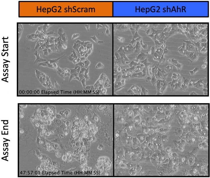 The images on the right show human hepatocellular carcinoma cells with the expression of the target AhR being killed upon treatment with the identified lead compound. The images on the left are human hepatocellular carcinoma cells without the target AhR.
