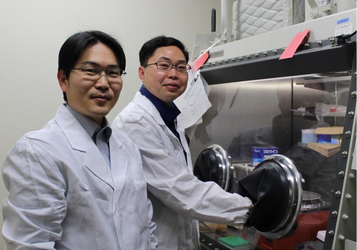 image: Researchers (left: Tsuyoshi Michinobu, right: Yang Wang) fabricating thin-film transistors.