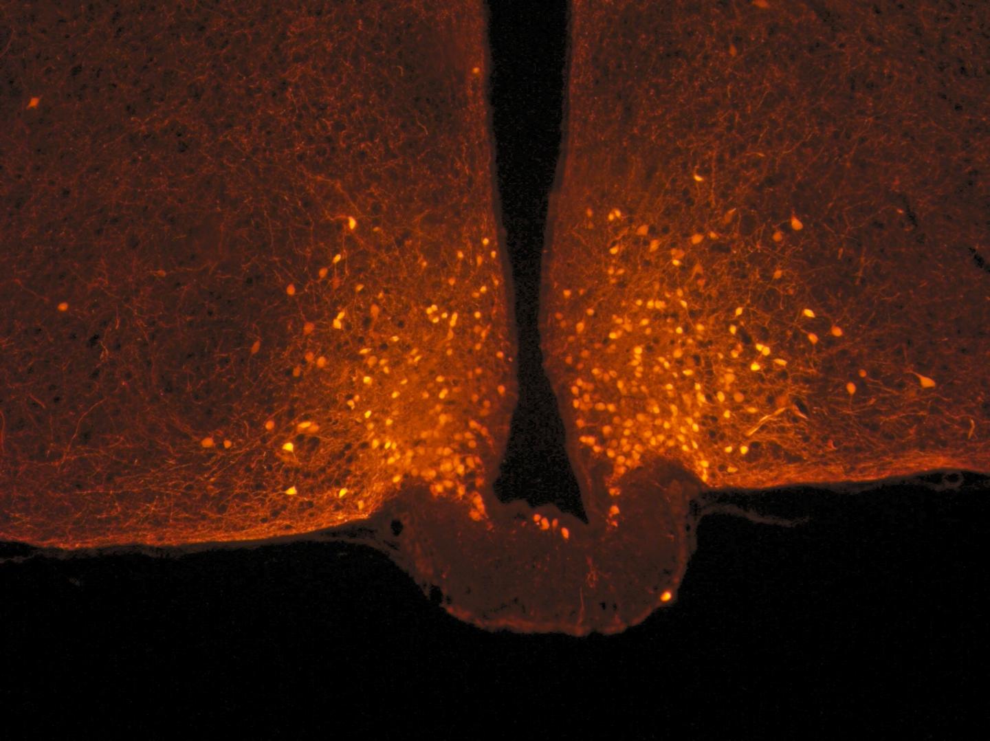 image: POMC neurons (orange dots) in the hypothalamus of a mouse, located at the base of the brain. Photo taken from a mouse using a confocal microscope.