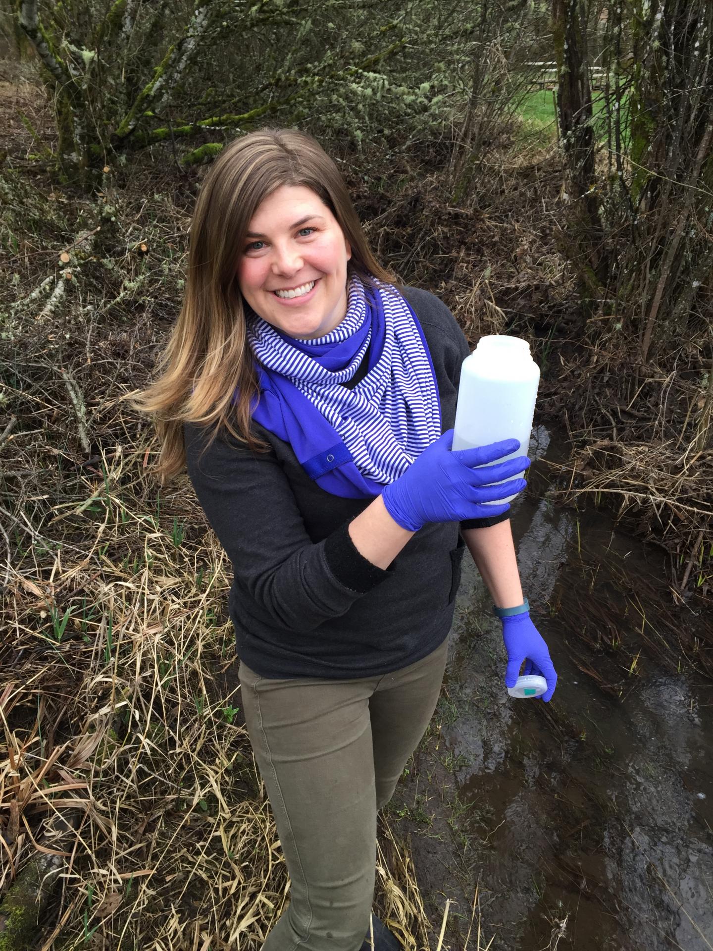image: USDA Forest Service research fish biologist Brooke Penaluna collects water samples to test for fish eDNA.