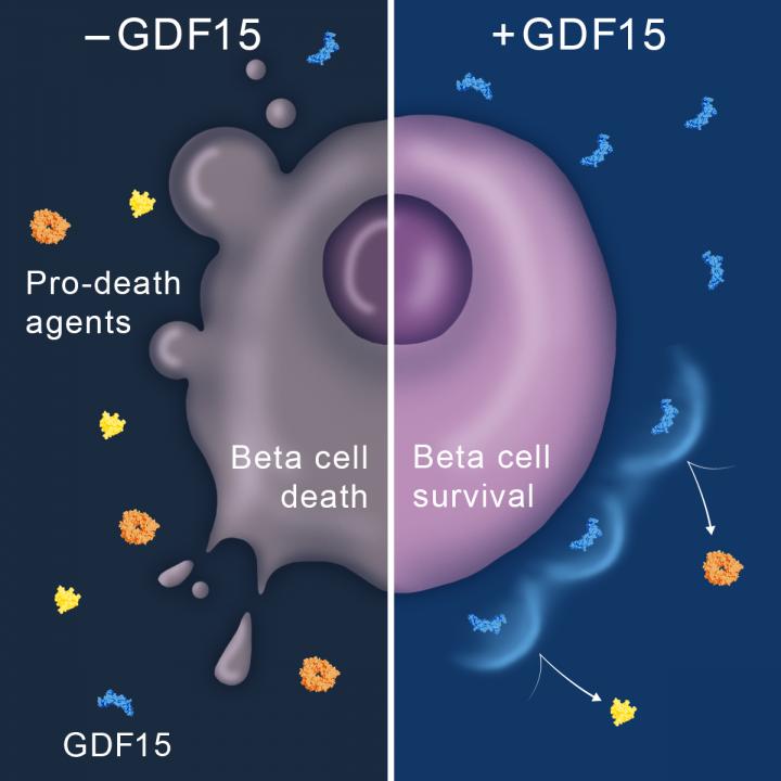 image: Inflammatory agents deplete growth differentiation factor 15 (GDF15) and kill susceptible beta cells to cause type 1 diabetes. Adding back GDF15 protects beta cells in treated mice.