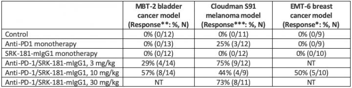 As detailed in the Science Translational Medicine publication "Selective inhibition of TGFβ1 activation overcomes primary resistance to checkpoint blockade therapy by altering tumor immune landscape", SRK-181 inhibits TGFβ1 activation with high selectivity and has demonstrated in preclinical studies the potential to overcome primary resistance and meaningfully expand the number of patients who could benefit from checkpoint inhibitor therapy. (Martin et al., Sci. Transl. Med. 12: 25 March 2020)