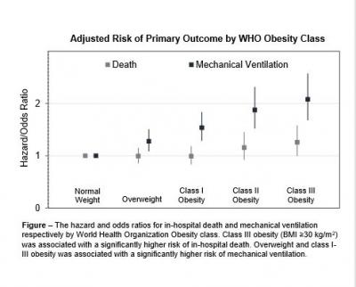 image: Above diagram illustrates the hazard and odds ratios for in-hospital death and mechanical ventilation, respectively, by World Health Organization Obesity class. Class III obesity (BMI ?30 kg/m2) was associated with a significantly higher risk of in-hospital death. Overweight and class I-III obesity was associated with a significantly higher risk of mechanical ventilation.