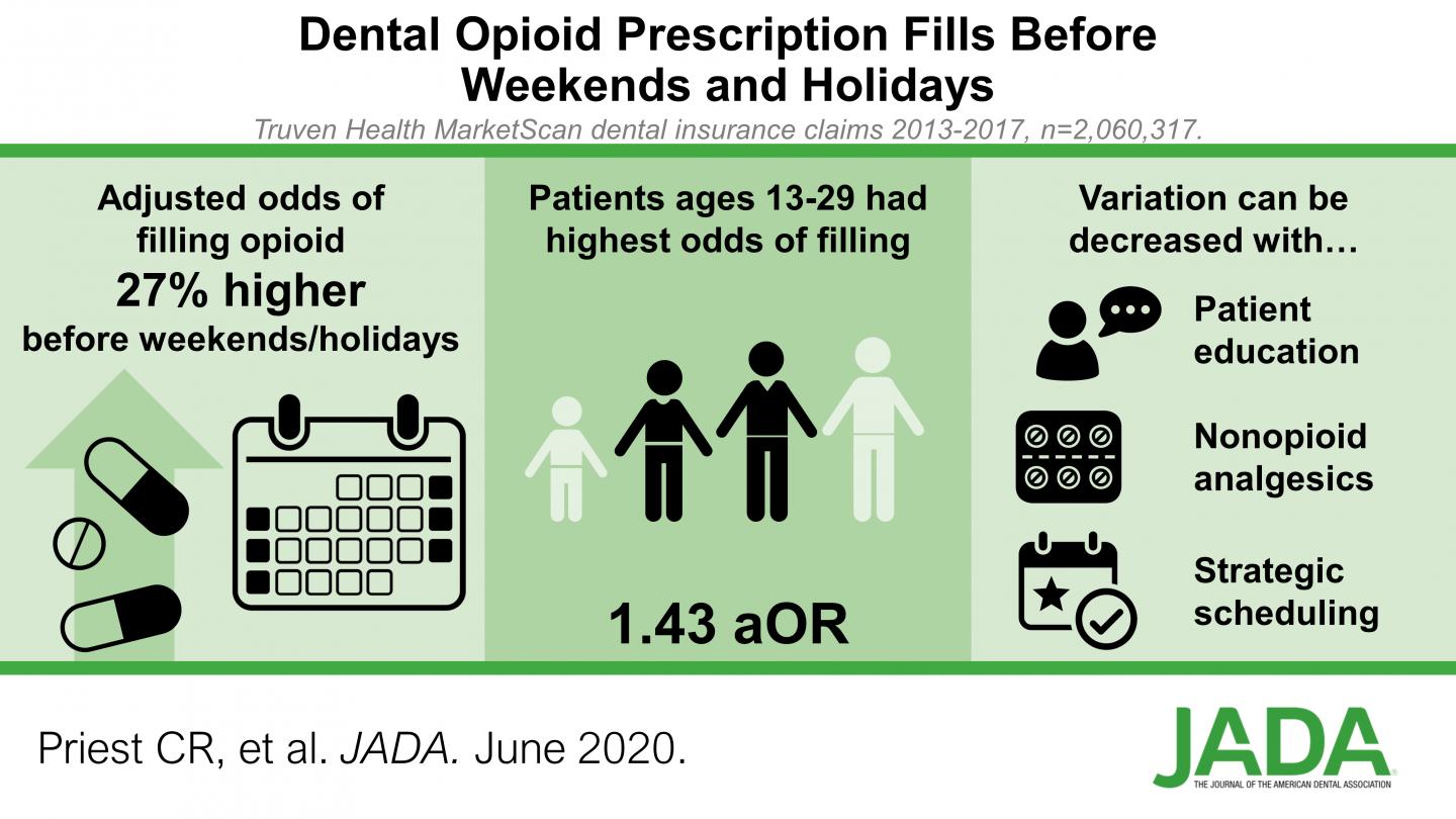 Half of the patients who filled an opioid prescription had had scheduled surgical tooth extractions, but the pre-weekend and pre-holiday increase was seen across all 11 dental procedures studied.