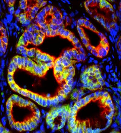 image: Mouse pancreatic tumor cells (red) produce the signaling protein IL-1β (green) to support cancer growth by suppressing the immune system.