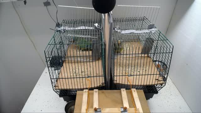 video: A peach-fronted conure waits for its partner to arrive, before they pull each their end of the string simultaneously and get rewarded with a snack each.