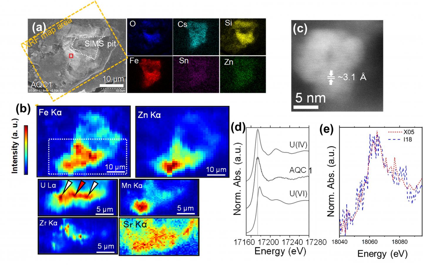 image: (a)Electron imaging of a CsMP with elemental maps. (b) Synchrotron micro-focus X-ray fluorescence (μXRF) elemental maps. (c) Image of uranium dioxide inclusion in the CsMP. (d) Uranium L3-edge X-ray absorption near-edge structure (XANES) of a discrete point, indicated by the red arrow in (b). The spectrum is plotted alongside U(IV) and U(VI) oxide standards. (e) Discrete-area Pu L3-edge XANES collected from the point indicated by the red arrow.