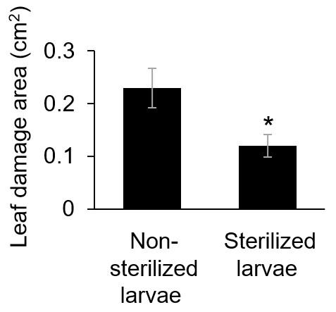 image: Levels of damage to A. thaliana leaves after exposure to S. litura larvae raised under conditions that did or did not sterilize their oral secretions. The asterisk indicates a statistically significant difference between the damage levels under the different conditions