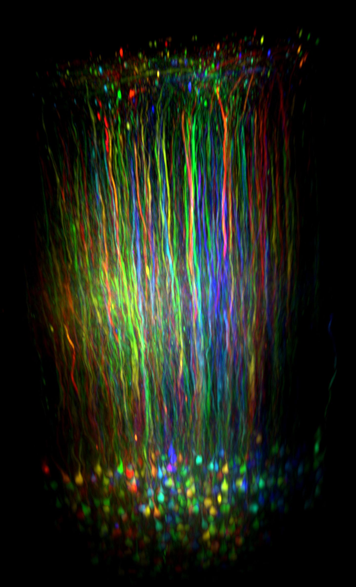 image: The cell bodies of the neurons of layer 6 are shown at the bottom of this image. Neurons have dendrites, which pass through other layers of the cortex and collect information from these layers. The dendrites of layer 6 neurons can span the full length of the cortex. They are almost 1 mm long.