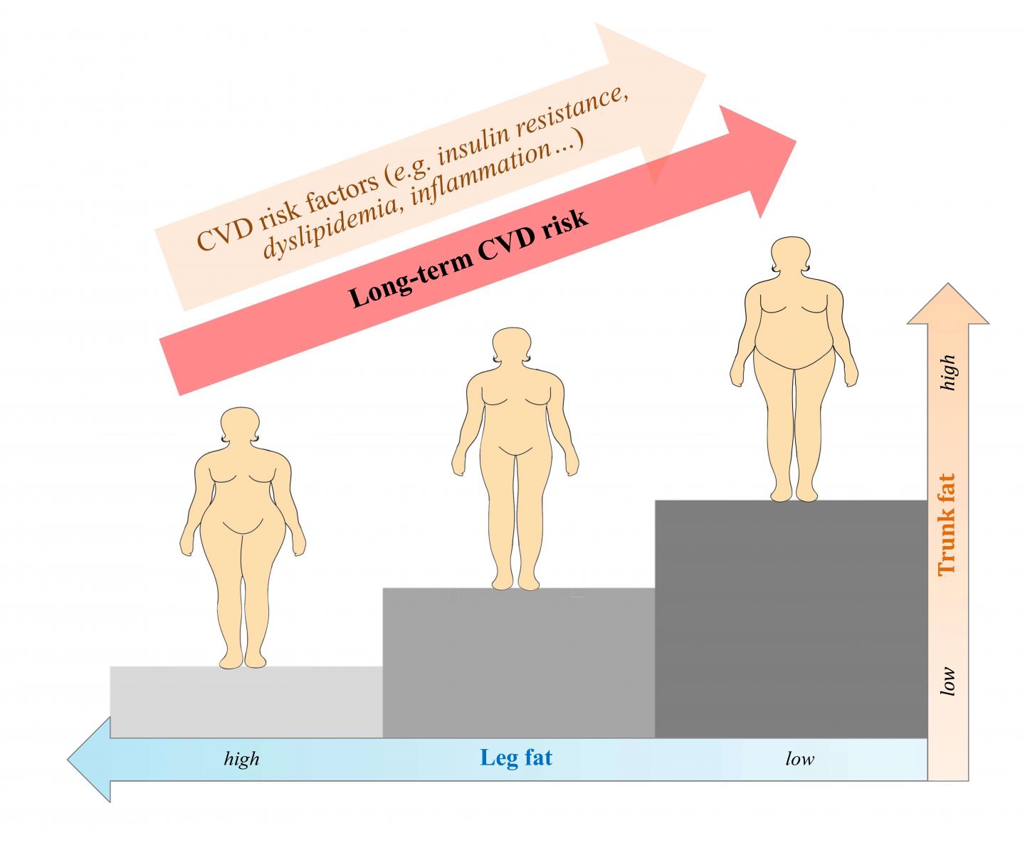 image: Among postmenopausal with normal body mass index, higher trunk fat is associated with increased risk of cardiovascular disease, whereas higher leg fat is associated with decreased risk of cardiovascular disease.