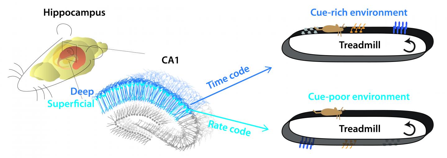 Results of the two experiments were consistent. It was found that the hippocampus uses different neural circuits and information processing strategies depending on the environmental conditions. In the object-free environments, a group of cells located in the superficial region of CA1 tends to be active and uses a rate code since the animal position is best predicted by changes in the frequency of action potentials discharged by single neurons. In contrast, in a complex, object-strewn environment, a group of cells in the deep region of CA1 tend to be active and uses a phase code since the animal position is best predicted by the timing of a neuron action potentials relative to the ensemble of active neurons.