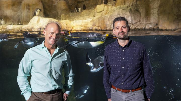 image: Nebraska researchers Jay Storz (left) and Anthony Signore with penguins at Omaha's Henry Doorly Zoo. Storz, Signore and their colleagues resurrected two ancient versions of hemoglobin, demonstrating how the blood of penguins evolved to help them better hold their breath while hunting for seafood.