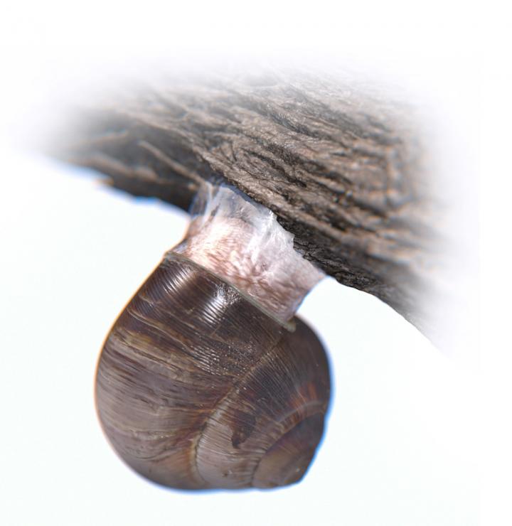image: Snails can anchor themselves in place using a structure known as an epiphragm. The snail's slimy secretion works its way into the pores found on even seemingly smooth surfaces, then hardens, providing strong adhesion that can be reversed when the slime softens. Penn Engineers have developed a new material that works in a similar way.