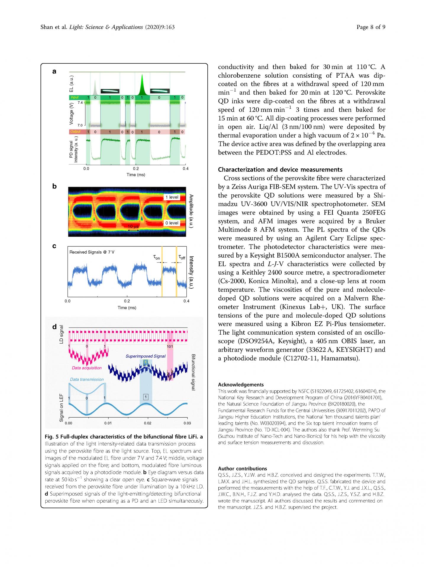In a new paper published in Light Science & Application, a team of scientists, led by Professor Haibo Zeng from MIIT Key Laboratory of Advanced Display Materials and Devices, Institute of Optoelectronics & Nanomaterials, School of Materials Science and Engineering, Nanjing University of Science and Technology, China, and co-workers have developed a wearable LiFi based on electroluminescence-photodetection bifunctional fibers enabled by perovskite QDs with hybrid components. The bifunctional fibers possess the narrowest luminescence spectrum of ~19 nm, more importantly, the capability of simultaneously transmitting and receiving information.
