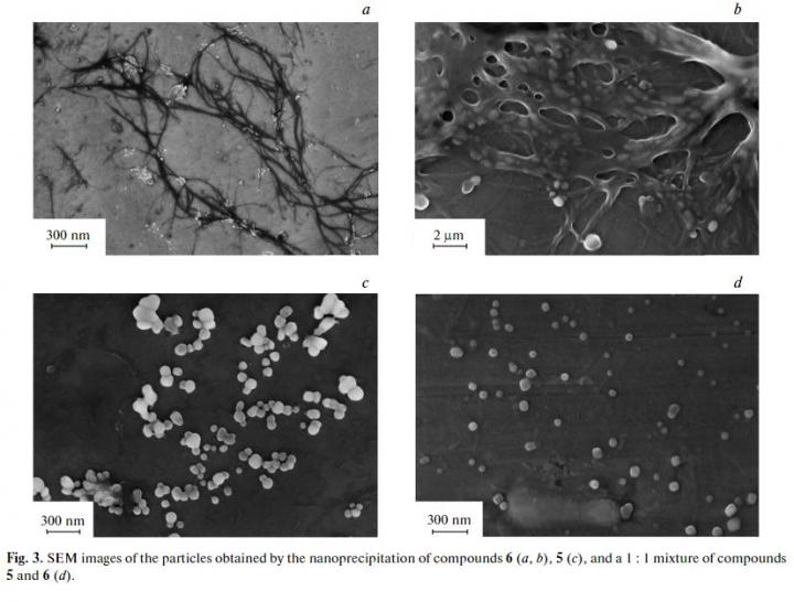 image: SEM images of the particles obtained by the nanoprecipitation of compounds 6 (a, b), 5 (c), and a 1 : 1 mixture of compounds 5 and 6 (d).