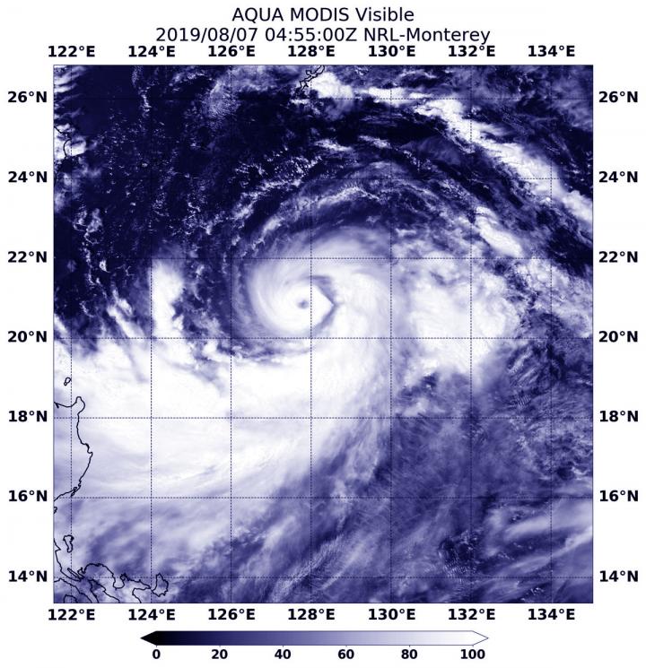 On Aug. 7, 2019 at 12:55 a.m. EDT (0455 UTC), the Moderate Resolution Imaging Spectroradiometer or MODIS instrument aboard NASA's Aqua satellite provided a visible image of Lekima that revealed a clear eye surrounded by a tight, circular band of powerful thunderstorms. Lekima also has a large band of thunderstorms that are feeding into the center from the south and east.