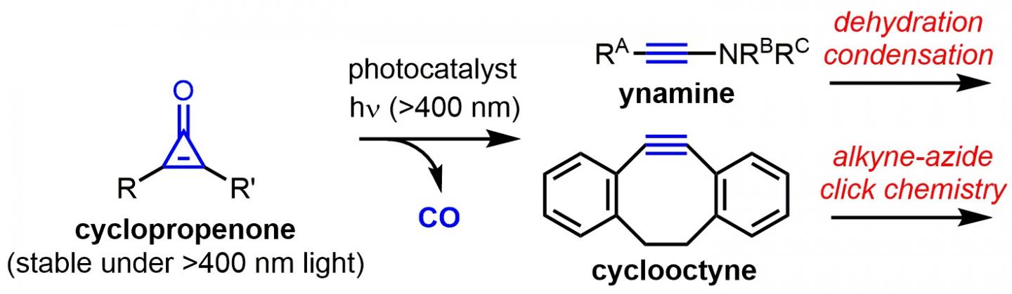 Alkynes are a group of organic compounds that are used to manufacture industrial reagents and polymers. Photolysis of a cyclopropenone with UV-light is a useful method to generate a highly reactive alkyne. However, if the reaction mix contains accompanying compounds that are sensitive to UV light, they will degenerate. Therefore, performing this reaction in the presence of visible light instead will keep such compounds intact. A research team at Kanazawa University has identified catalysts that can facilitate the photolysis of visible-light-stable cyclopropenones under visible-light conditions.