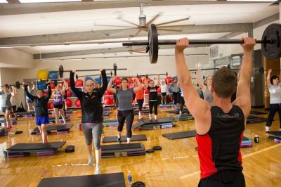 Students get a full body workout in a Body Pump class taught by OSU exercise science student Jacob Taskinen.
