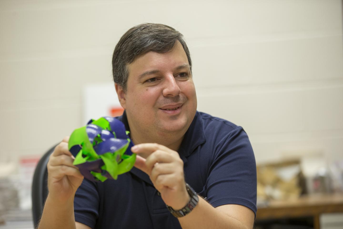 image: UC associate professor Alexandre Sousa holds a neutrino model that changes color when tossed in the air to demonstrate how neutrinos change "flavor."