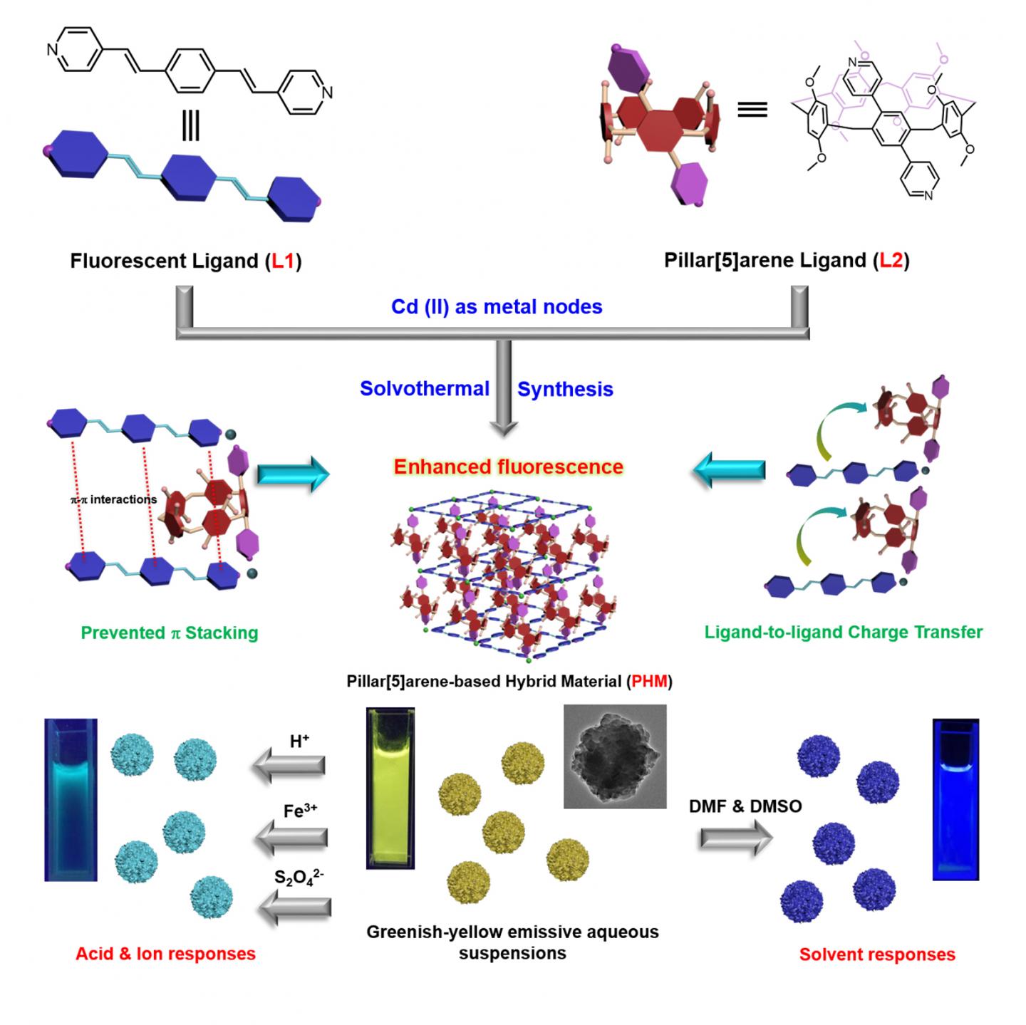 In a research article published in the Beijing-based National Science Review, scientists at Jilin University in Changchun, China, report the successful fabrication of a pillar[5]arene-based multicolor hybrid material (PHM), which possesses enhanced emission in both solid state and solution phases and stimuli-responsive luminescent properties (Scheme 1). A linear π-conjugated chromophore oligo(phenylenevinylene) (OPV) has been chosen as the fluorescent ligand, while the pillar[5]arene rings serves as the rigid macrocycle skeleton. With the two ligands integrated via coordination with Cd (II), the afforded hybrid material can perform desirable optimized fluorescence and well-tuned emission in response to external stimuli including solvents, particular ions, and acid, whereby three emission colors of PHM are obtained, i.e., greenish yellow (pristine), mazarine (solvent variation), and cyan (ions and acid).