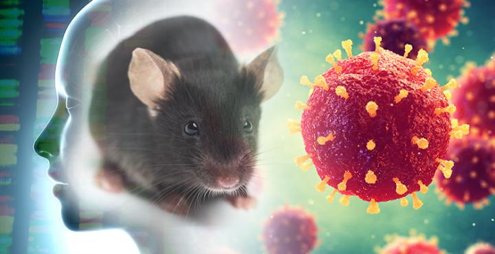 image: Artists interpretation of mouse and human genetic data and immune cells representing human diseases.