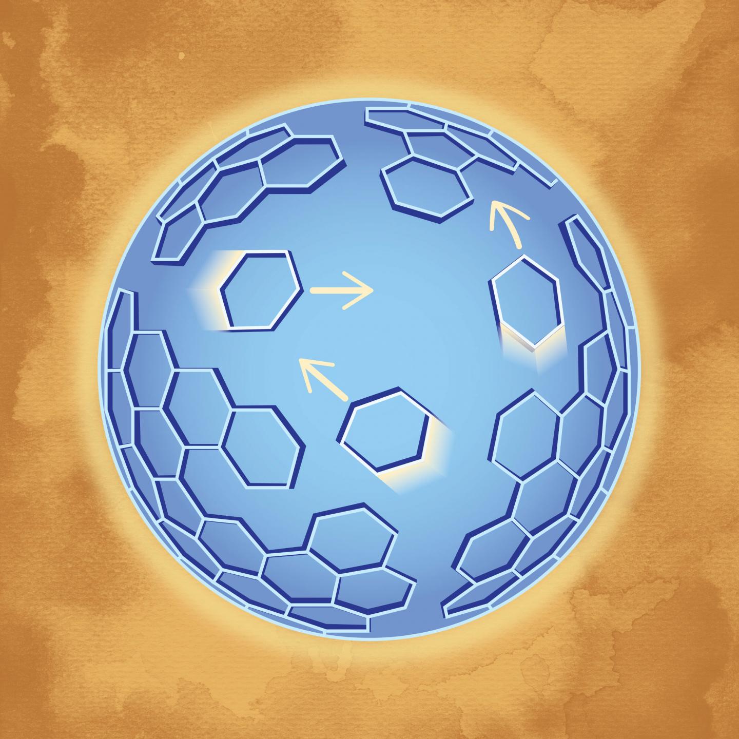 image: An artist's rendition of Gag molecules proteins that form lattice hexagonal structure diffusing across the virus-like particles.