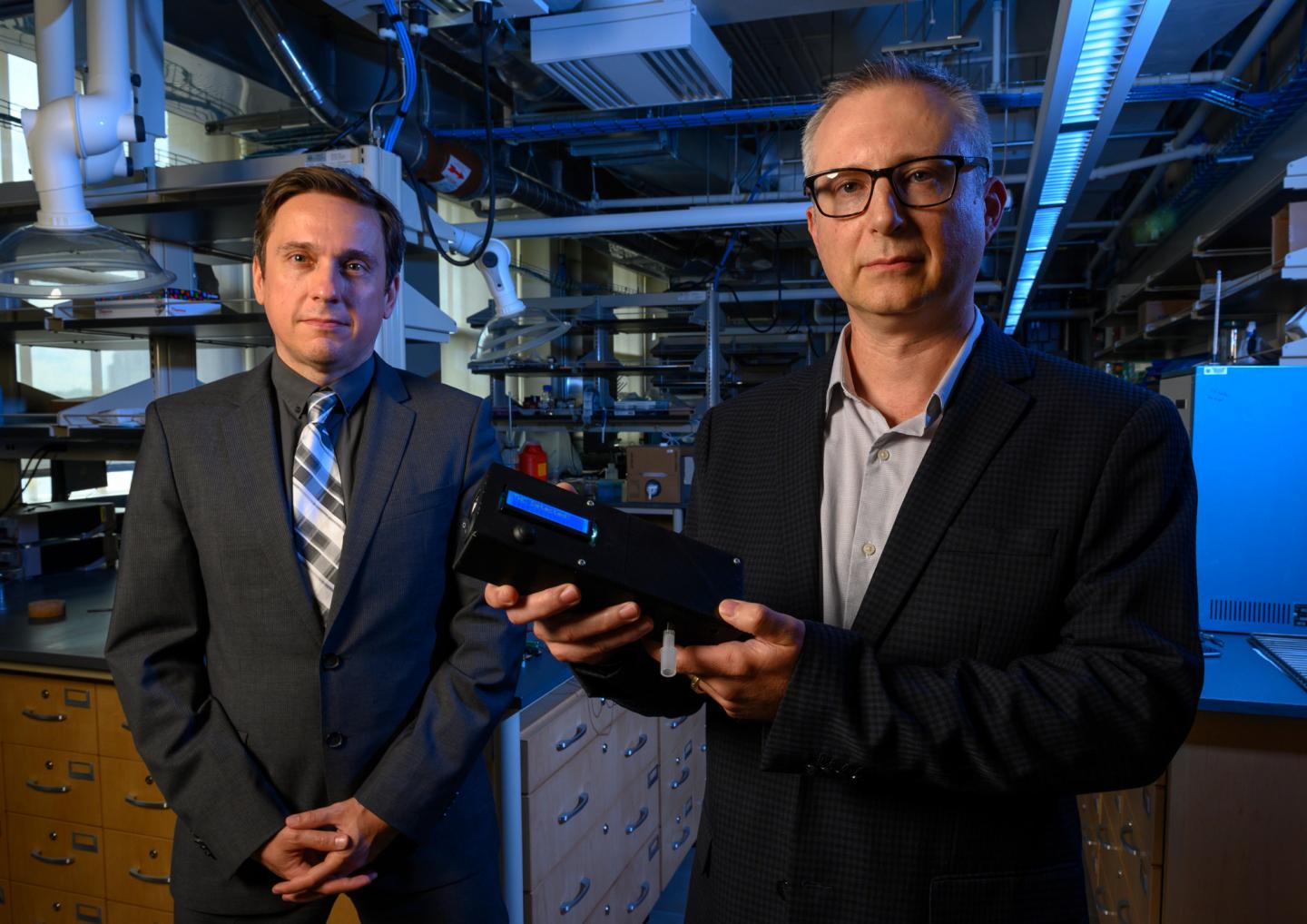 image: Ervin Sejdic, PhD (left) and Alexander Star, PhD, hold up the prototype of their THC-detecting device.