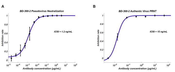 image: Neutralization potency of BD-368-2 antibody against pseudovirus and authentic virus, IC50 reached 8pM and 100pM respectively.