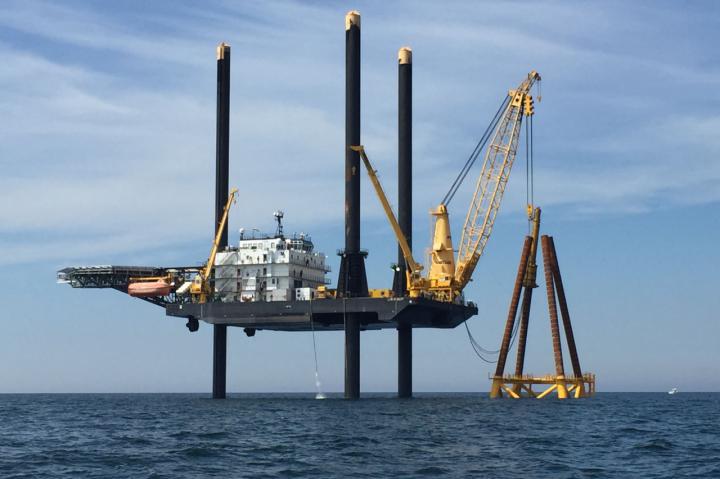 image: Construction of the Block Island Wind Farm off Rhode Island, the first offshore wind farm in the United States. It began commercial operations in December 2016.