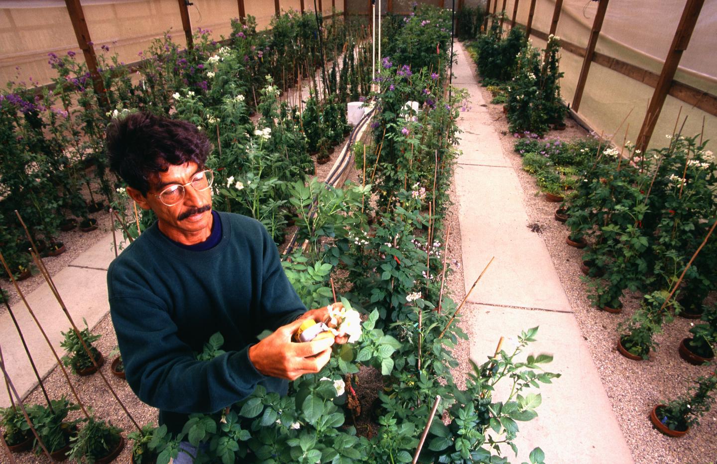 image: Project gardener Charles Fernandez demonstrates pollination techniques used to propagate seed of wild potatoes maintained at the U.S. Potato Genebank in Sturgeon Bay, WI.