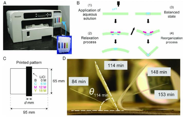 image: The cartridges of an inkjet printer were filled with aqueous LiCl solutions at different concentrations. Applying these solutions to paper causes it to spontaneously fold due to the relaxation and reorganization of cellulose fibers. Different concentrations result in different folding times and a changed folding start.