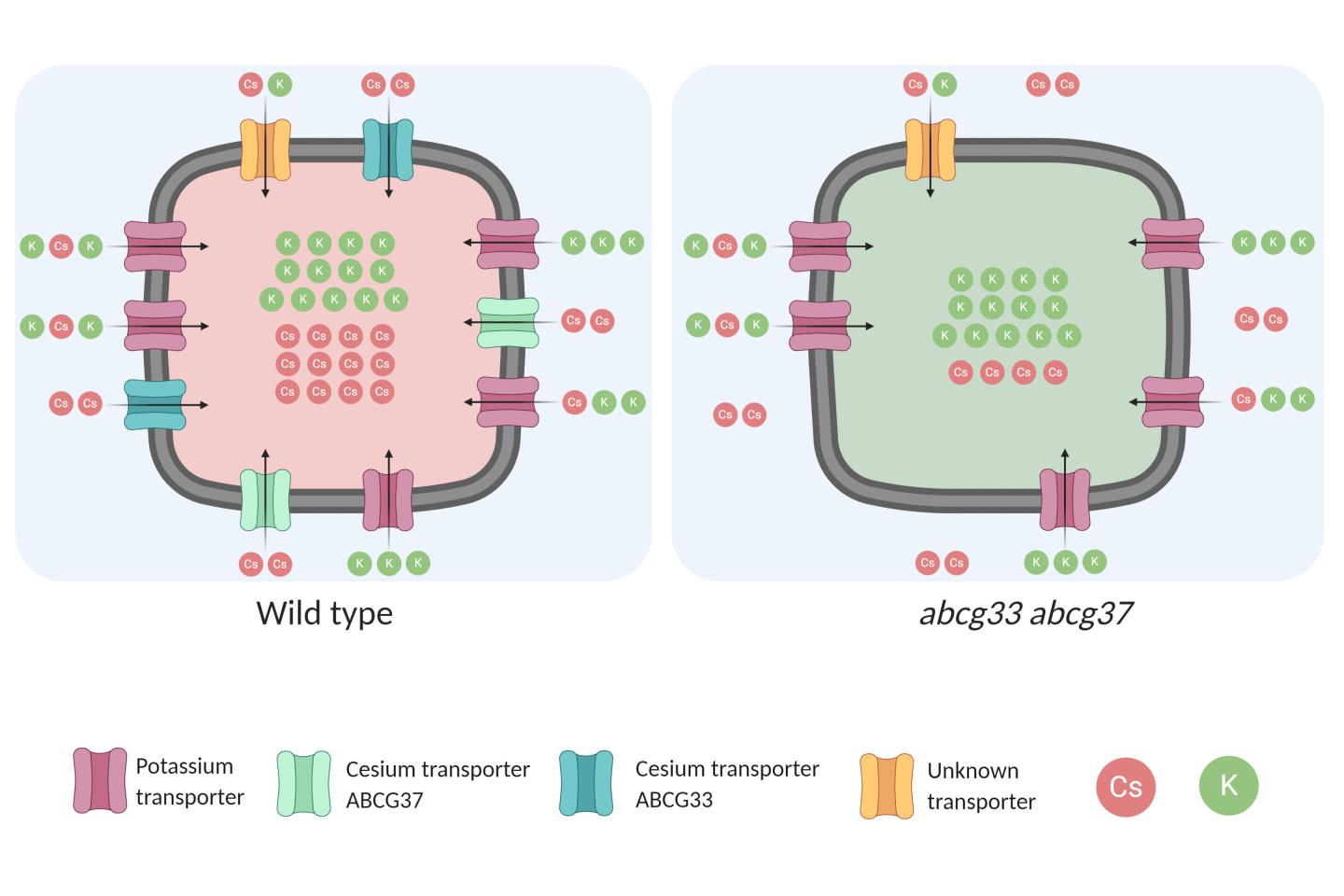 image: Proposed model suggested by researchers, where ABCG33 and ABCG37 uptake cesium inside the plant cell in a potassium-independent manner