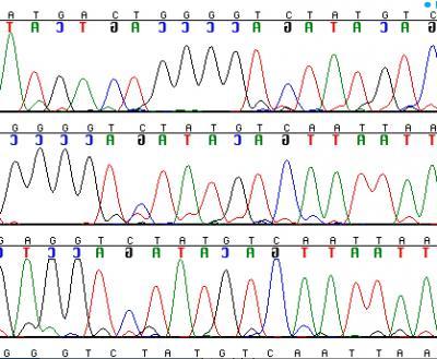 This images shows nucleotide differences in a short non-coding region of plastid DNA, such as typically used in plant barcoding. The lower two species are closely related and only differ in the A (Adenine) in position 2 from the left, while the top species is more distantly related and shows numerous differences.