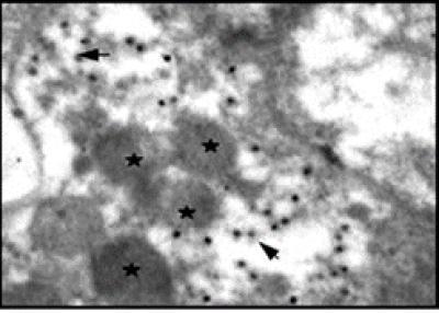 This shows the effects of acute cerebral infarction on platelet Golgi apparatus (↑ ) and alpha granule (★) distribution at 24 hours after onset.