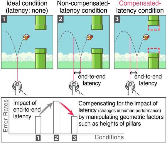 The model predicts the players' task success rate when latency is added to the gaming environment. Using these predicted success rates, the design elements of the game are geometrically modified to help players maintain similar success rates as they would achieve in a zero-latency environment. In fact, this research succeeded in modifying the pillar heights of the Flappy Bird game, allowing the players to maintain their gaming performance regardless of the added latency.