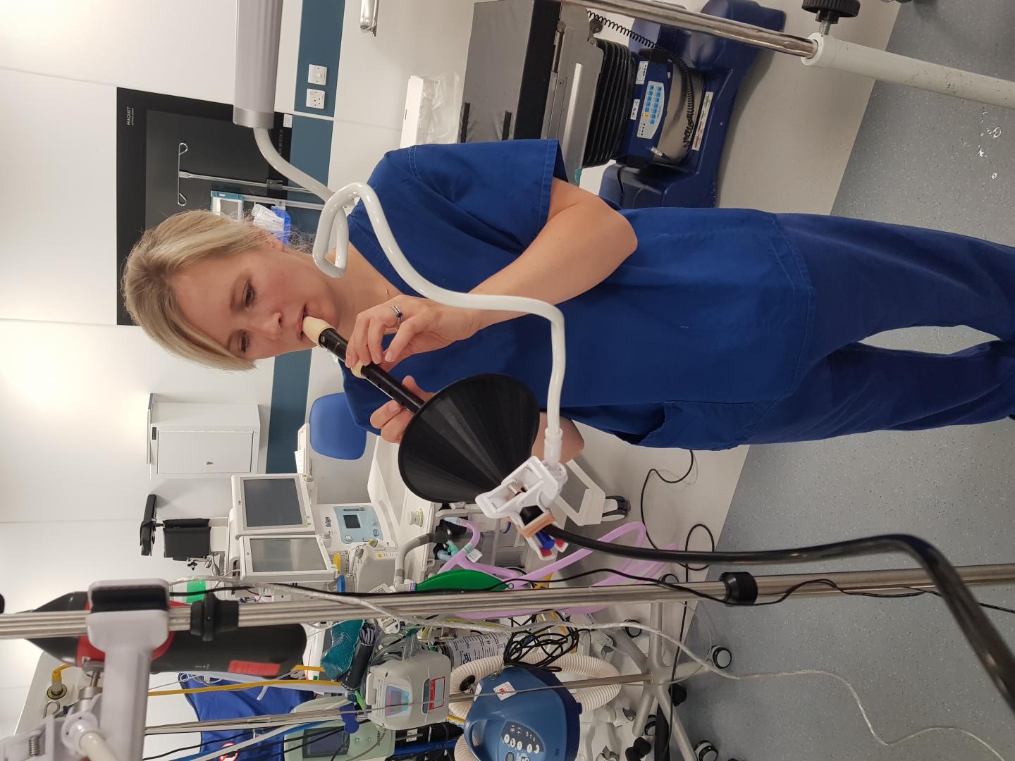 image: Classical musician and award-winning professional trumpeter Alison Balsom taking part in the PERFORM-2 study. Alison is pictured in an operating theatre (a zero aerosol environment) playing the recorder into a funnel that allows the researchers to measure the aerosols generated from playing the instrument.