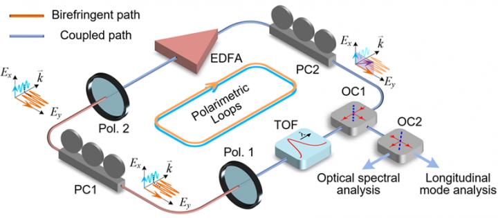 image: The system consists of a single spatial loop, in which two equivalent polarimetric loops are formed by recirculating light waves of orthogonal polarization states in the loop. To achieve PT symmetry, the phase retardance, power ratio, and coupling coefficient between the orthogonally polarized light waves are tuned by controlling PC1 in the birefringent path, and the lasing threshold is tuned by controlling PC2 in the coupled path. PC: polarization controller; Pol.: polarizer; EDFA: erbium-doped fiber amplifier; OC: optical coupler; TOF: tunable optical filter.