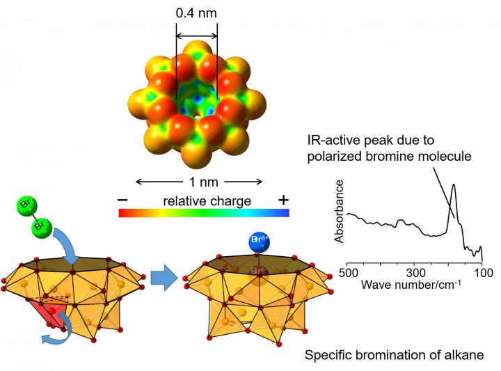 By using such a polarized and activated bromine molecule in the cavity of the vanadium oxide cluster, bromination of pentane yielded 2-bromopentane and 3-bromopentane in a ratio of 36:64, which differs from the ratio of 80:20 when bromination was carried out in the absence of vanadium oxide cluster, indicating different selectivity. In addition, concerning another product, 2,3-dibromopentane, which consists of diastereomers*5), the ratio of the threo isomer was higher than when bromine molecules alone were reacted with pentane. Furthermore, bromination could take place with smaller alkanes with shorter carbon chain such as butane or propane.