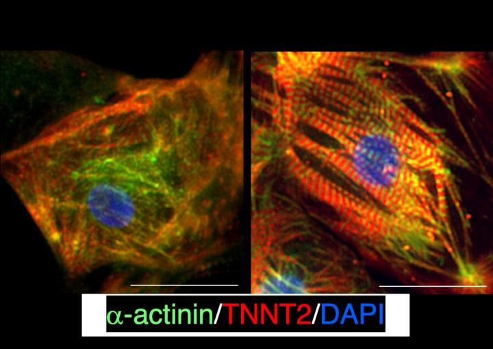 image: The image on the right shows more robust cardiac muscle fiber development when the gene FN1 is active. The fibers show clear, evenly spaced bands called sarcomeres. Typically, HLHS-affected hearts lack FN1 activity, resulting in fibers with indistinct, disorganized sarcomeres (left).