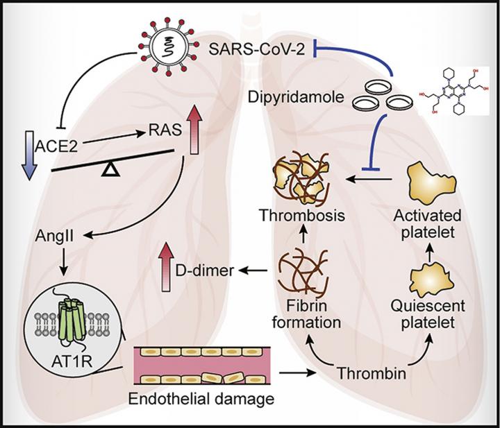 Effective antivirals with safe clinical profile are urgently needed to improve the overall prognosis. In an analysis of a randomly collected cohort of 124 patients with COVID-19, the authors found that hypercoagulability as indicated by elevated concentrations of D-dimers was associated with disease severity. By virtual screening of a U.S. FDA approved drug library, the authors identified an anticoagulation agent dipyridamole (DIP) in silico, which suppressed SARS-CoV-2 replication in vitro.