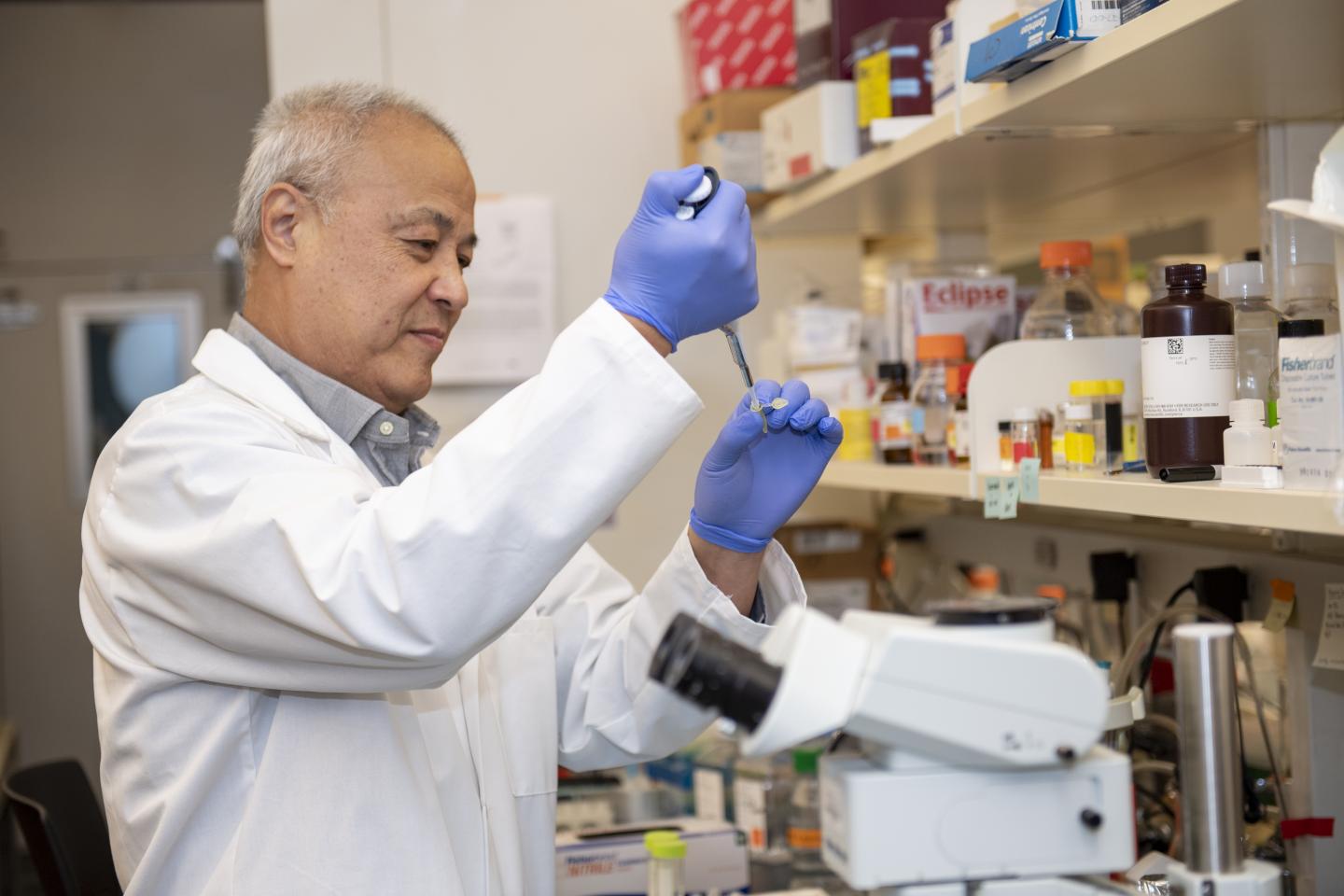 In the early 2000s, Qi developed SapC-DOPS, a combination of a cell protein, SapC, and a phospholipid, DOPS, that assembled into tiny cavities can selectively target cells and deliver therapies while sparing all other unaffected cells and tissues. In the past, he has studied that nanovesicle in cancer animal models looking at brain, lung, skin, prostate, blood, breast and pancreatic cancers. Results were promising, and now the human version of this nanovesicle is now being studied in clinical trials for treatment of glioblastoma.