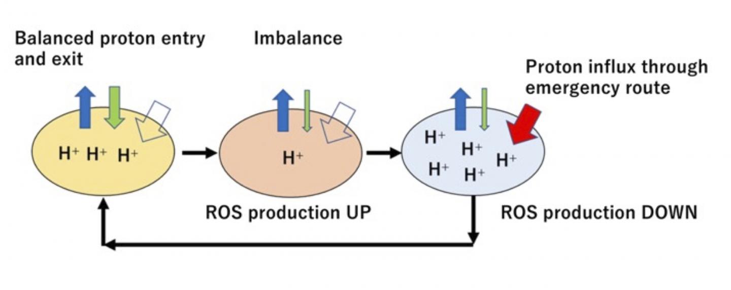image: When the balance of proton influx and efflux is lost and theproton inside the mitochondria is insufficient, the amount of ROS generated increases. Proton deficiency inside the mitochondria induces proton influx from the emergency route. Once the proton shortage inside the mitochondria is resolved, the emergency route is closed.
