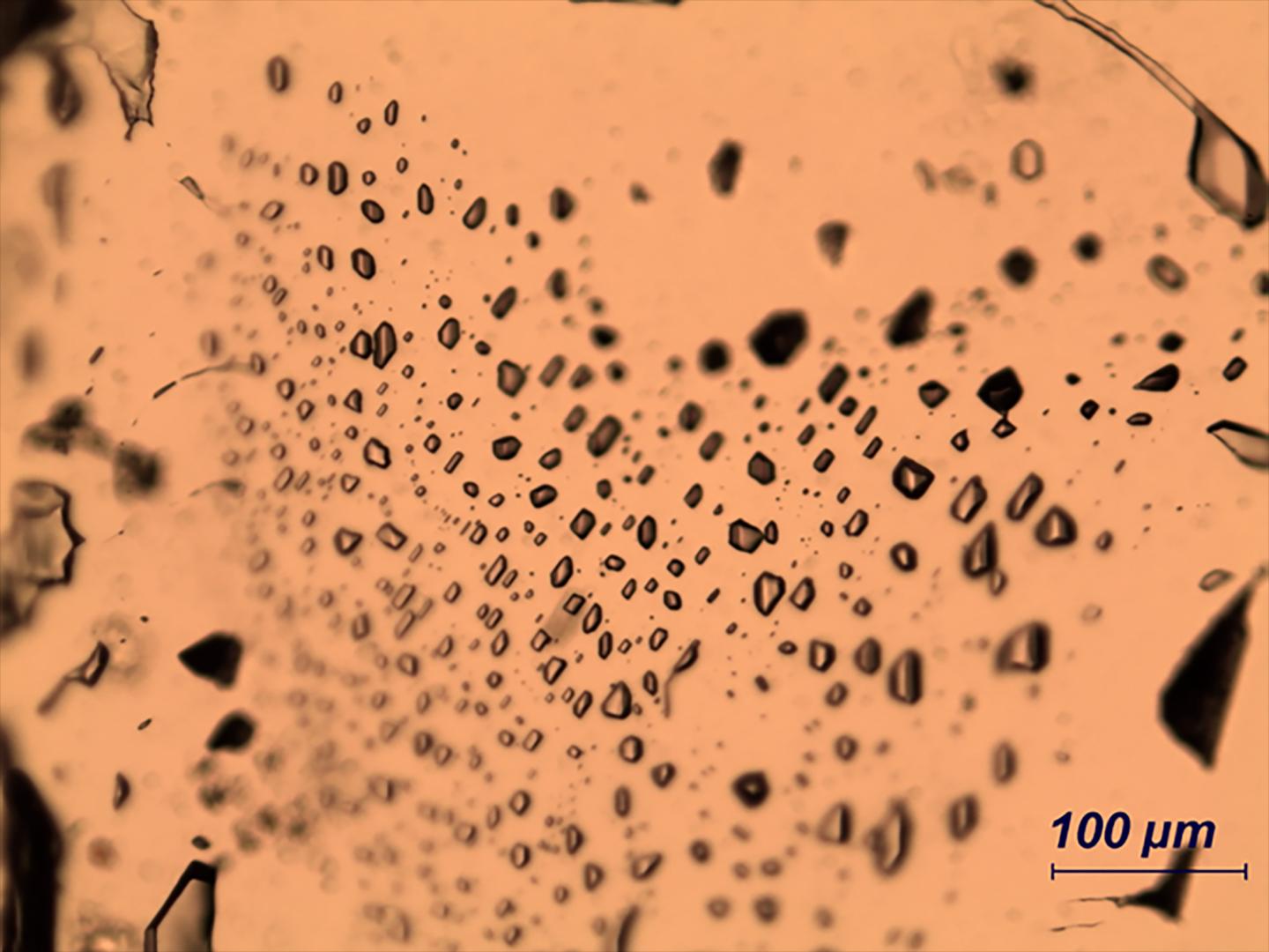 image: Gas-rich fluid inclusions containing CO2 (carbon dioxide) and CH4 (methane) were trapped in host minerals (here quartz) during crystal growth.