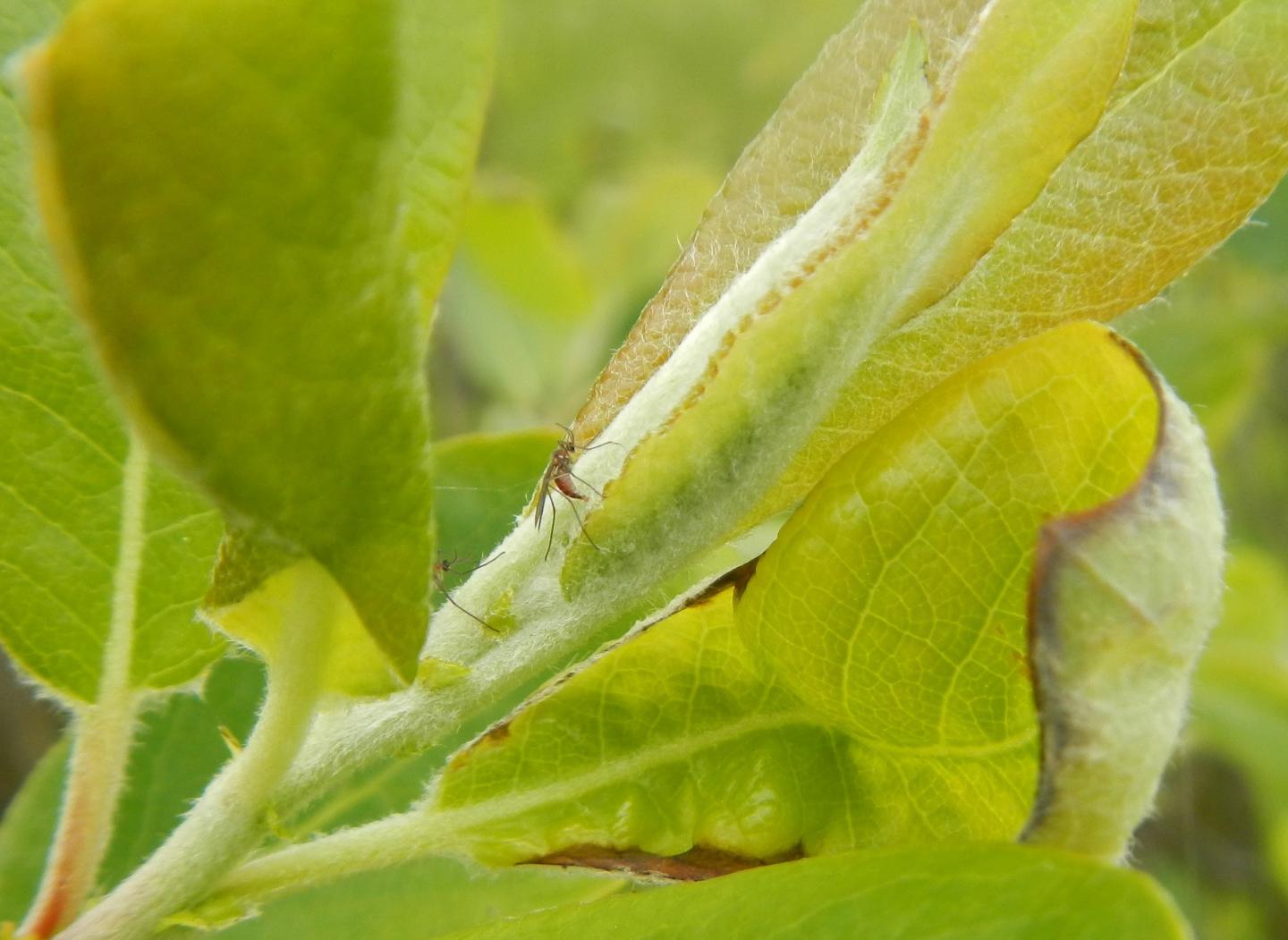 The fly Iteomyia salicisverruca lives on willow leaves in tooth-shaped growths called galls, which it induces in its larval stage. The natural enemies of this fly include several species of parasitic wasps. These wasps lay their eggs inside the fly larva within the gall, where they then develop into parasitic predators known as parasitoids. Before the adult wasp leaves the gall, it devours its host, the fly.