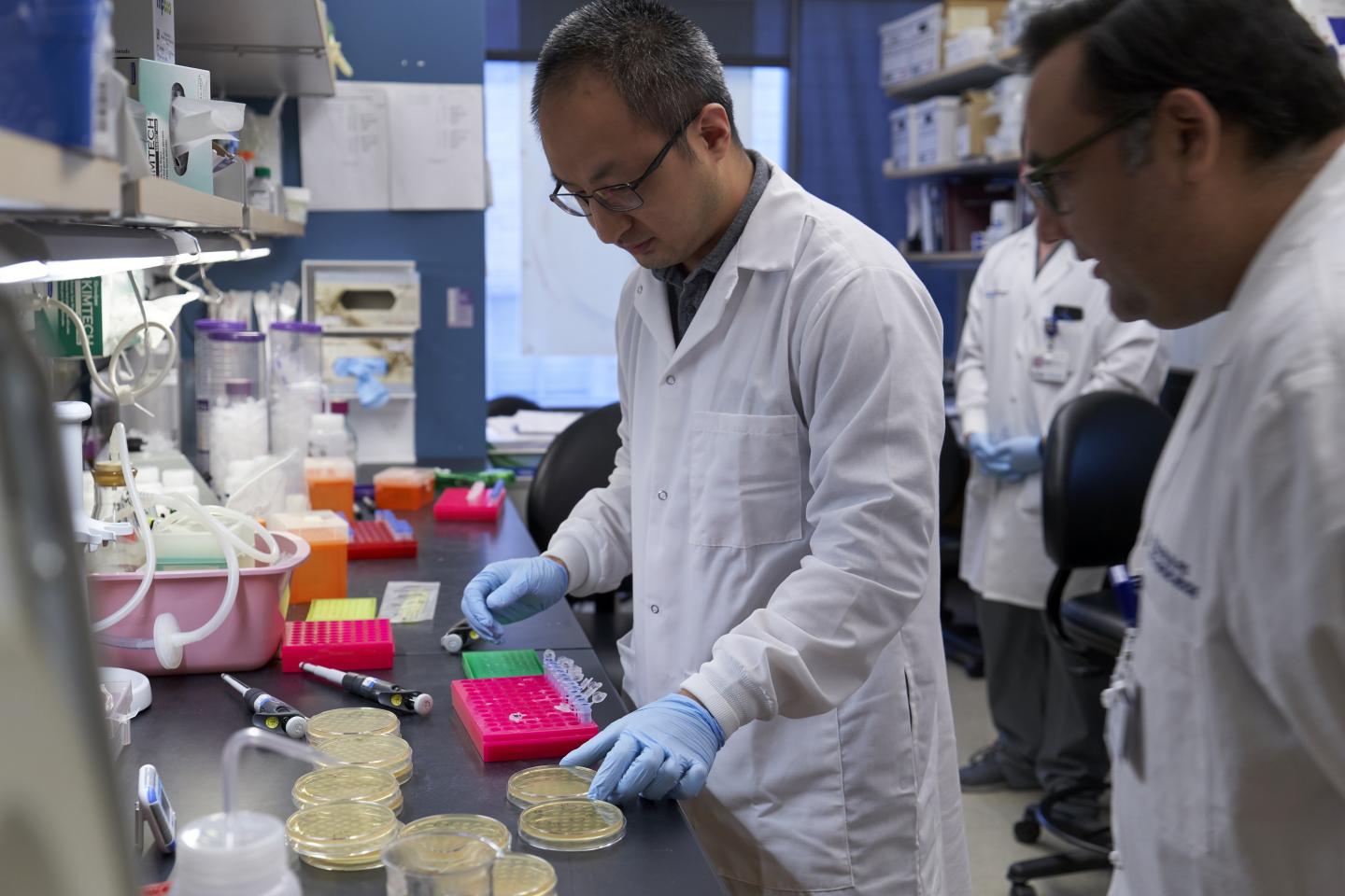 image: Houston Methodist physician scientist Eric Salazar, MD, PhD, looks on as his team works in the lab on convalescent plasma research.
