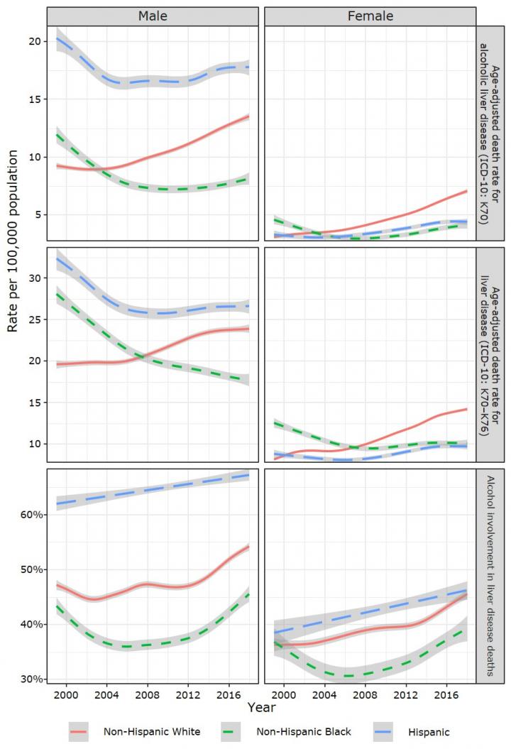 --Alcohol involvement in liver disease remained highest among Hispanics. Historically, sex disparities in drinking were more pronounced in Hispanics than in other racial/ethnic groups. The authors suggest that heightened rates among Hispanic women may be attributed to increases in female drinking driven by acculturation.