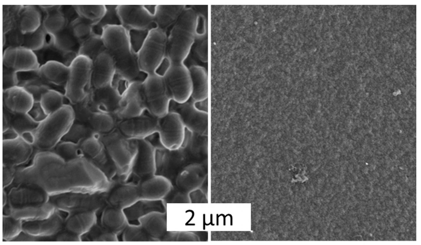 image: Scanning electron microscope images give overwhelming proof of the difference. Left: A biofilm forms on the surface of polycaprolactone, a biodegradable plastic frequently used in medicine. Right: Spider silk does not allow for biofilm formation.